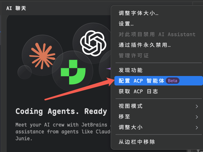 如上文所配的图所示,你可以在 AI Assistant 插件右上角的下拉菜单中找到「配置 ACP 智能体」的功能, 点击后会打开一个 acp.json 文件,此时即可配置 ACP 了。